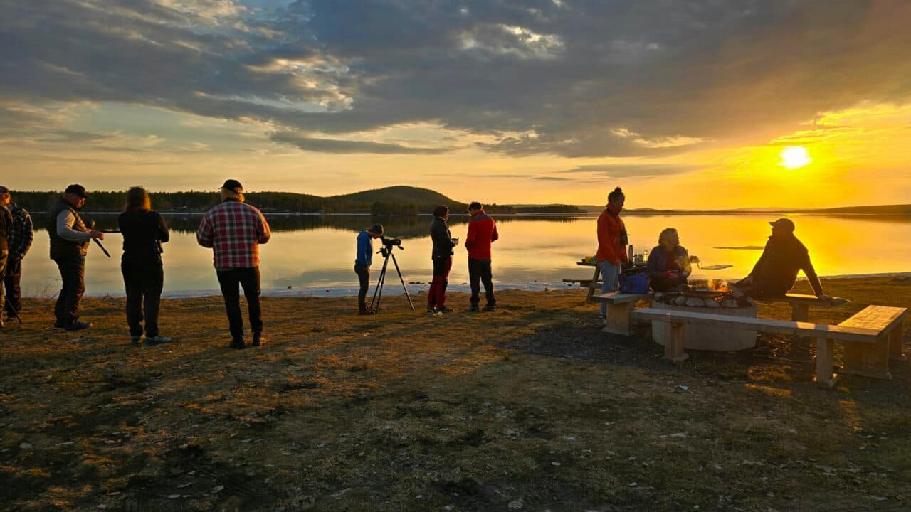 I Vaikijaur födosökte flera grönbenor och en enkelbeckasin vid små vattensamlingar på de öppna fälten. Några storspovar stod på isen ner mot vattnet. Vid Fjällglimten hade en brasa redan tänts. Vi grillade korv, fikade, samtalade och skådade. Vi såg bland annat småskrake, ringduva, silltrut samt svart-, glutt- och drillsnäppa. En läcker fiskgjuse kom flygande och lät oss beskåda dess typiska silhuett med de långa vingarna och den ljusa undersidan. Timmarna flög i väg och även denna gång fick vi njuta av en fantastiskt vacker vy med spegelblankt vattnet, fjäll i bakgrunden och solstrålar som bröt genom molnen.