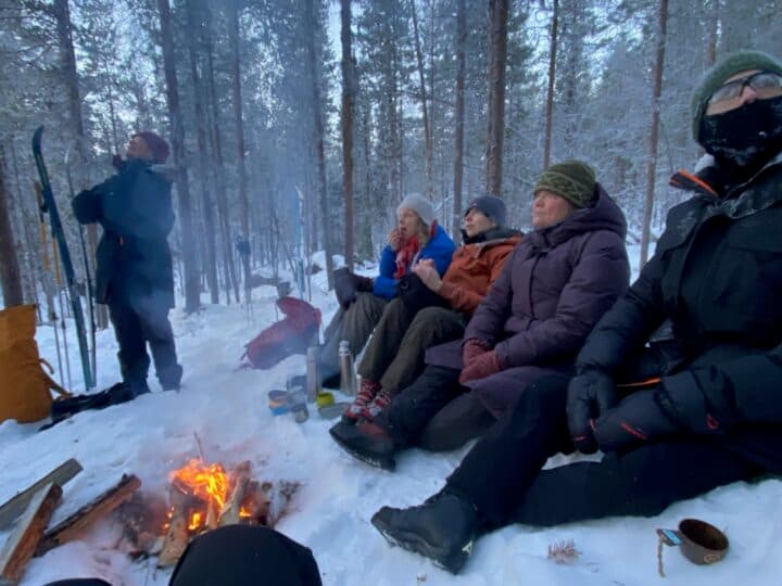 När vi samlades vid Rinken kl 9:30 visade termometern vid spårtavlan på minus 22 grader. Molntäcket på himlen vara uppklarnande. Lotta och Annsofi gick till fots mot Getbergets fågelmatning medan Linda, Guilhem och Ida tog vägen över Södra Åsleden ned emellan åsarna och ut över Klipptjärn. Lotta och Annsofi fick se och höra en järpe på vägen och skidfararna möttes av en flock med gråsiskor som klängde i en björk.