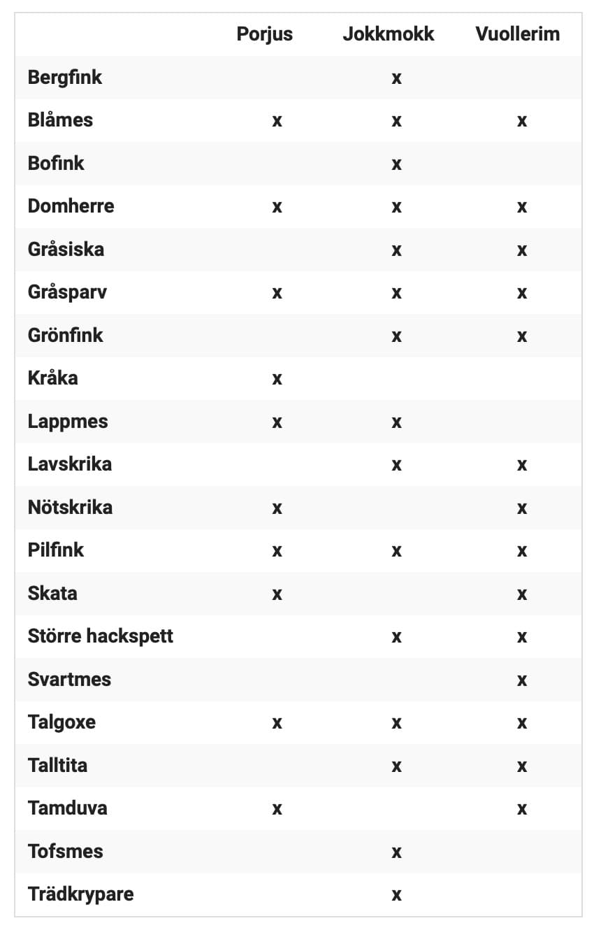Totalt såg vi 15 arter som födosökte vid matningarna. Det blev en väldigt lyckad dag med glada miner och trötta ben. Ekoskådning när den är som allra bäst. Jokkmokks lagledare vill rikta ett stort tack till alla som på något sätt varit med och bidragit. Tack till alla lagkamrater, tack till alla er som låtit oss spana vid era matningar och tack till alla er som vi träffat på längs vår väg. Era hejarop gav oss extra energi. Det känns fint att veta att så pass många bryr sig om våra fåglar. Tack!