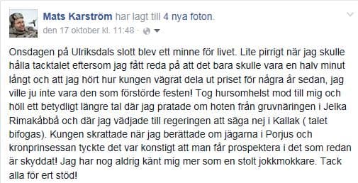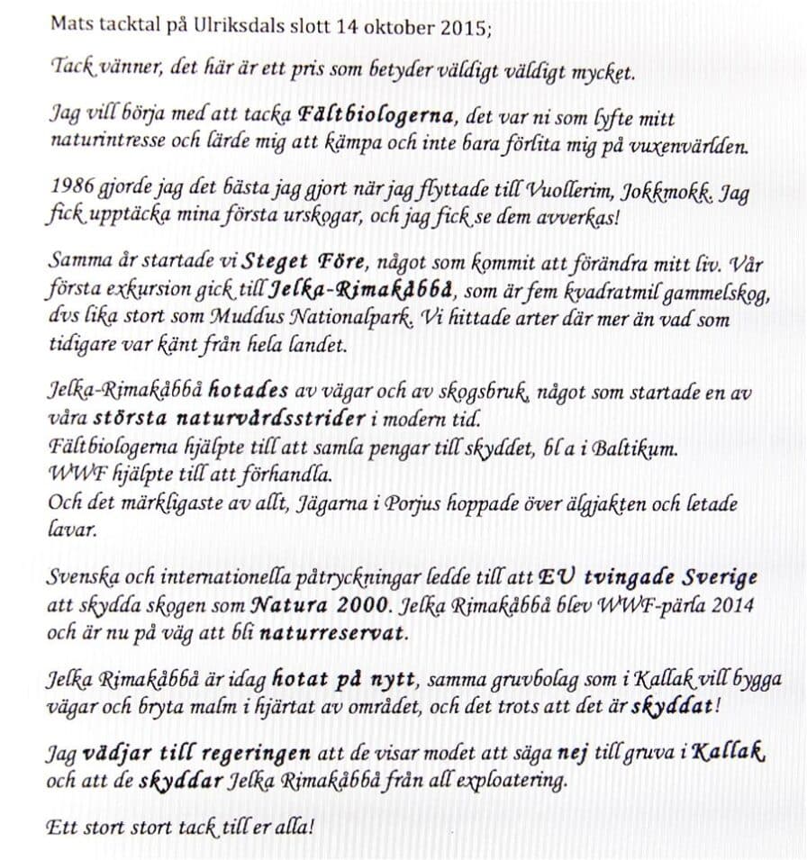 Beatric Rindelvall på ”Supermiljöbloggen” beskriver dagen så här: Mats Karström tackar Fältbiologerna